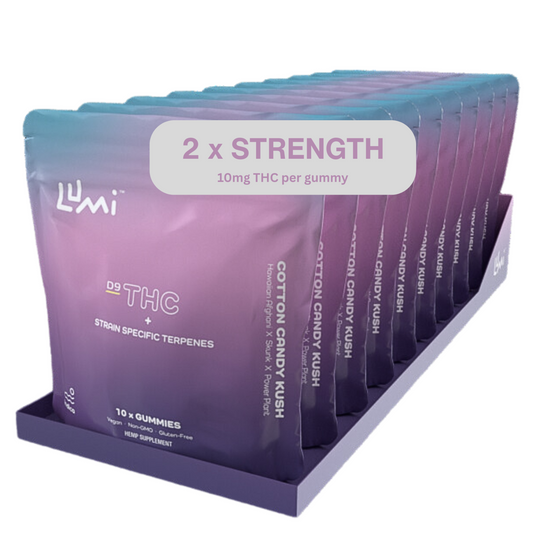 Each Lumi Double Strength Gummy contain 10mg THC and 10mg Strain-Specific Cannabindoids and Terpenes. 10 gummies per bag, 10 bags per case.